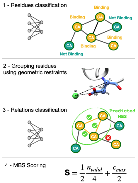 The prediction of MoM2 can be broken down into three steps. First, amino acids from the protein of interest are classified as being either part of the metal binding site, next to an amino acid which is part of the binding site, or not part of the metal binding site at all. This decision is based on the properties of the graph representing the protein structure around each amino acid (shown in Figure 1). Secondly, once all metal binding site amino acids have been assigned, these are then grouped and assigned to a particular binding site. This step uses the BioMetAll algorithm originally developed by the group of Jean-Didier Maréchal from the Autonomous University of Barcelona. Essentially, animo acids are assigned to binding sites using distance and angle constraints extracted from existing scientific literature. In the final stage, the predictions made by MoM2 are assessed using a set of feed forward neural networks. Each site is given a score, and if amino acids are predicted to belong to multiple sites, then the site with the highest score is chosen, to reduce redundancy.