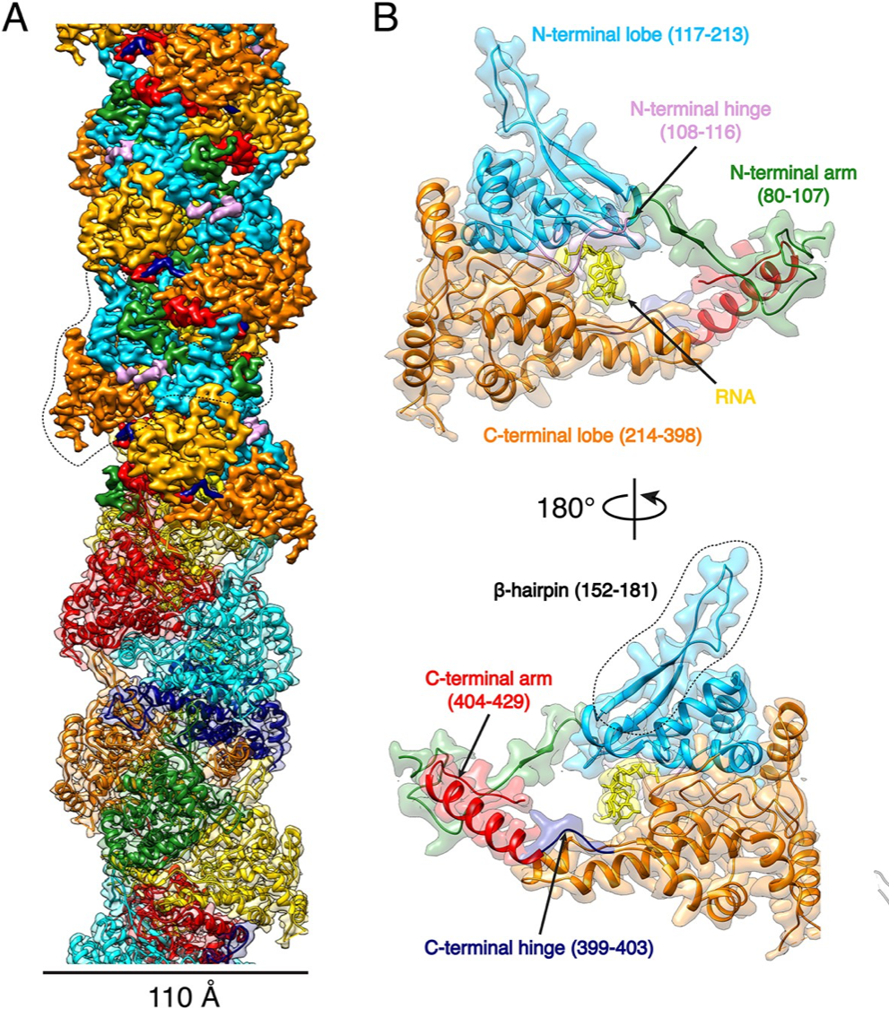 Cryo-EM has allowed researchers to see, in detail, how the viral RNA and proteins interact to build the nucleocapsid. The high resolution structure (3.3 A) of the virus nucleocapsid allowed to trace the amino-acid chain into the EM density and revealed a positively-charged groove in which the RNA sits. Usually, nucleocapsids are flexible and therefore difficult to study, but cryo-EM has pin-pointed the structure of the Hantaan virus nucleocapsid with near-atomic precision. Each nucleoprotein interacts with 6 others within the nucleocapsid, which explains its rigidity.
